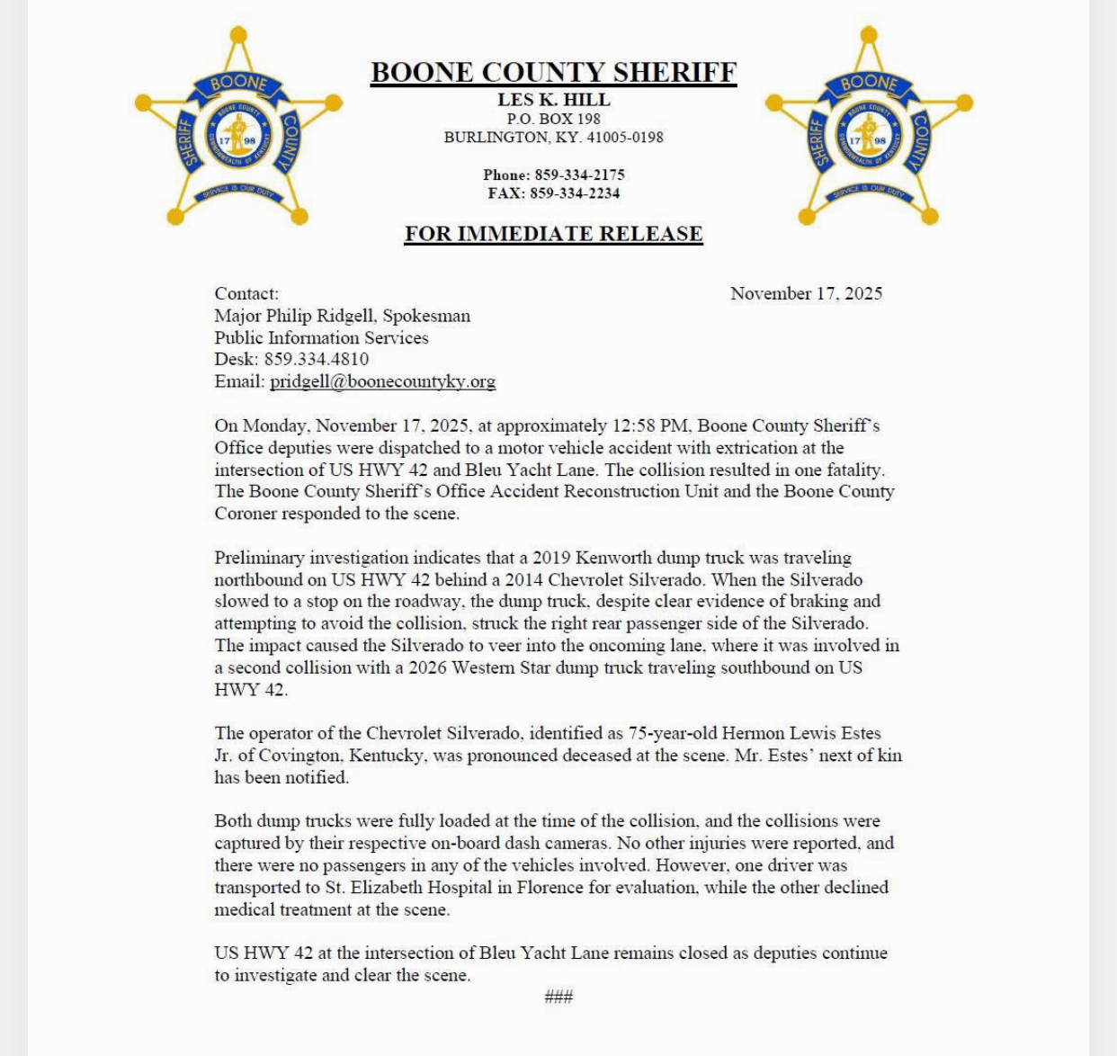 The Boone County Sheriff’s Office extended condolences to Mr. Estes’ family in their public statement, expressing appreciation for the patience and cooperation of motorists and witnesses who were affected by the road closure and investigative efforts. Officials acknowledged the profound trauma that such incidents have on both families and first responders.